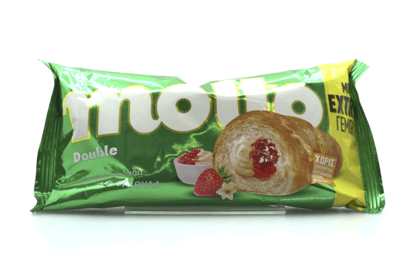Κρουασάν με γέμιση κρέμα με γεύση βανίλια και γέμιση φράουλα. Συστατικά: Ζύμη: αλεύρι σίτου, φυτικά έλαια (φοινικέλαιο, ηλιέλαιο), ζάχαρη, σιρόπι γλυκόζης-φρουκτόζης, μαγιά, αλάτι, σταθεροποιητής (μόνο- και διγλυκερίδια των λιπαρών οξέων), βανιλλίνη, μέσο οξίνισης (κιτρικό οξύ). Γέμιση κρέμα με γεύση βανίλια 16,5%: ζάχαρη, φοινικέλαιο, άπαχο γάλα σκόνη, δεξτρόζη, αιθυλική αλκοόλη, κρόκος αυγού σκόνη, γαλακτωματοποιητής (πολυγλυκερίδια των λιπαρών οξέων), σταθεροποιητής (κόμμι κυτταρίνης), μέσα οξίνισης (δισόξινο πυροφωσφορικό νάτριο, φωσφορικό οξύ), αρωματική ύλη βανίλιας , λακτόζη (γάλα). Γέμιση φράουλα 16,5%: σιρόπι γλυκόζης-φρουκτόζης, φράουλες, ζάχαρη, πηκτικό μέσο (πηκτίνη), μέσα οξίνισης (κιτρικό οξύ, κιτρικό ασβέστιο), φυσική αρωματική ύλη. Η γέμιση φράουλα περιέχει 30% φράουλες. Παράγεται σε εργοστάσιο που διαχειρίζεται ως πρώτες ύλες: αραχίδες, φουντούκια, αμύγδαλα, φυστίκια, καρύδια πεκάν, σουσάμι, σέλινο. Διατηρείται σε δροσερό και ξηρό μέρος