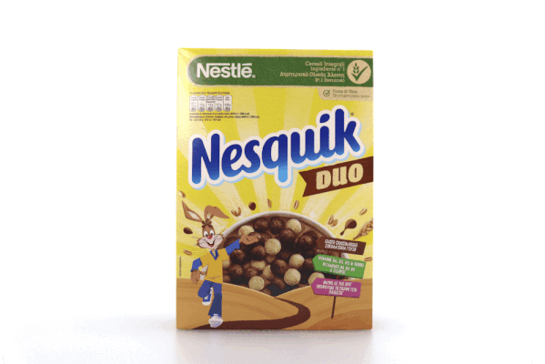 Μπάλες δημητριακών με γεύση σοκολάτας (72,4%) και με επικάλυψη λευκής σοκολάτας (27,6%) NESQUIK® DUO 325g. Τα παιδιά χρειάζονται ένα θρεπτικό και γευστικό πρωινό για να ξεκινήσουν την ημέρα τους με ενέργεια! Οι τραγανές μπαλίτσες NESQUIK® DUO με δημητριακά ολικής άλεσης και την σοκολατένια γεύση, που λατρεύουν τα παιδιά,σε συνδυασμό με μπαλίτσες με επικάλυψη λευκής σοκολάτας αποτελούν πηγή φυτικών ινών. Επιπλέον, είναι εμπλουτισμένα με βιταμίνες Β6, Β3, Β5 & Σίδηρο. Ο σίδηρος συμβάλλει στην ομαλή φυσιολογική γνωσιακή ανάπτυξη του παιδιού. Το παντοθενικό οξύ (Β5) συμβάλλει στη φυσιολογική νοητική επίδοση και οι βιταμίνες Β3 & Β6 συμβάλλουν στη φυσιολογική ψυχολογική λειτουργία. Επίσης, περιέχουν βιταμίνη D που συμβάλλει στη φυσιολογική απορρόφηση/χρησιμοποίηση του ασβεστίου και του φωσφόρου και στη διατήρηση της φυσιολογικής κατάστασης των οστών. Έτσι, σε συνδυασμό με το γάλα ή το γιαούρτι, τα παιδικά δημητριακά της Nestl? αποτελούν ένα θρεπτικό πρωινό γεύμα για τα παιδιά. Γιατί με τα δημητριακά NESQUIK® τα πρωινά γίνονται πιο όμορφα! Δημητριακά ολικής άλεσης Νο. 1 Συστατικό.